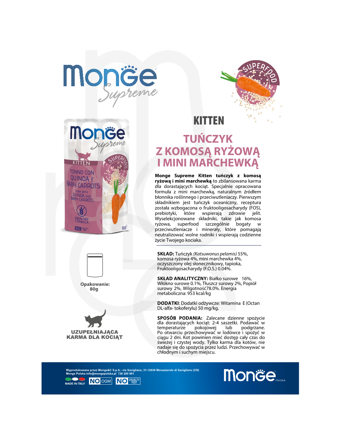 Monge Natural Superpremium Supreme Cat Kitten Thunfisch mit Quinoa und Mini-Karotten ist ein ausgewogenes Futter für heranwachsende Kätzchen. Köstliche Filetstücke aus gedämpftem Fleisch, das alle Nährwerte behält und zudem leicht verdaulich ist