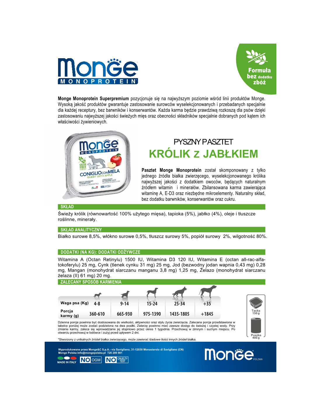 Monge MONOPROTEIN Kaninchen mit Apfel ist eine schmackhafte Pastete aus der Monge-Linie der Single-Protein-Futtermittel, die aus ausgewähltem Kaninchenfleisch von höchster Qualität mit dem Zusatz von Apfel hergestellt wird. Eine 100% italienische Rezeptur, reich an den Vitaminen A, E und D3, mit einer garantierten Proteinquelle aus nur einer Fleischsorte. Ohne künstliche Farb- und Konservierungsstoffe. Zuckerfreie Formel.