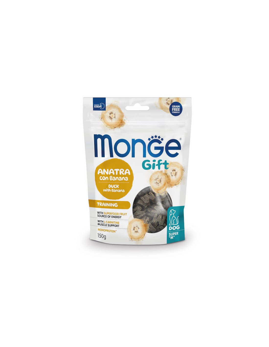 Monge Gift Super „M“ Training Dog Adult Duck mit Banane ist ein köstlicher Snack mit der Kraft von Superfood in Form von feuchten Kroketten in Form des Buchstabens „M“.