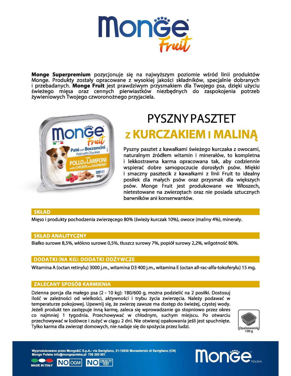 MONGE FRUIT ist eine leckere Pastete mit frischem Hühnerfleisch und Früchten, einer natürlichen Quelle von Vitaminen und Mineralien. Es ist ein komplettes und leicht verdauliches Futter, das entwickelt wurde, um das tägliche Wohlbefinden von erwachsenen Hunden zu unterstützen. Als weiche und schmackhafte Pastete mit Fleischstücken ist die Fruit-Reihe die perfekte Mahlzeit für kleine Hunde und ein Leckerbissen für größere Hunde. Monge Fruit wird in Italien hergestellt, nicht an Tieren getestet und enthält keine künstlichen Farb- oder Konservierungsstoffe.