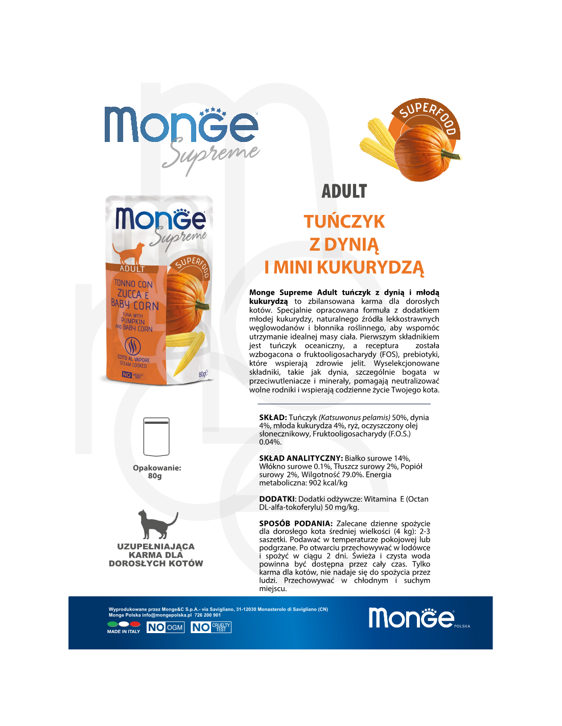 Monge Natural Superpremium Supreme Cat Adult Thunfisch mit Kürbis und Mini-Maiskolben ist ein ausgewogenes Ergänzungsfuttermittel für ausgewachsene Katzen. Leckere Filets aus dampfgegartem Fleisch, das alle Nährwerte bewahrt und leicht verdaulich ist.