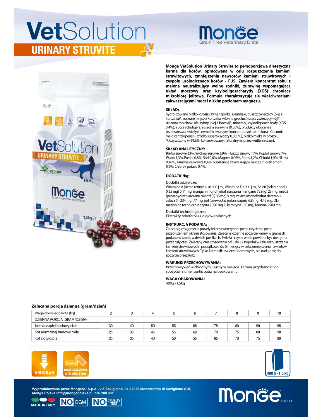 Fett: MONGE VETSOLUTION URINARY STRUVITE besteht aus dem richtigen Gehalt an Proteinen und Fetten, um die Bildung von MAP-Mikronährstoffen (Ammoniumorthophosphat (V) und Magnesium (II)-Hexahydrat) zu minimieren.