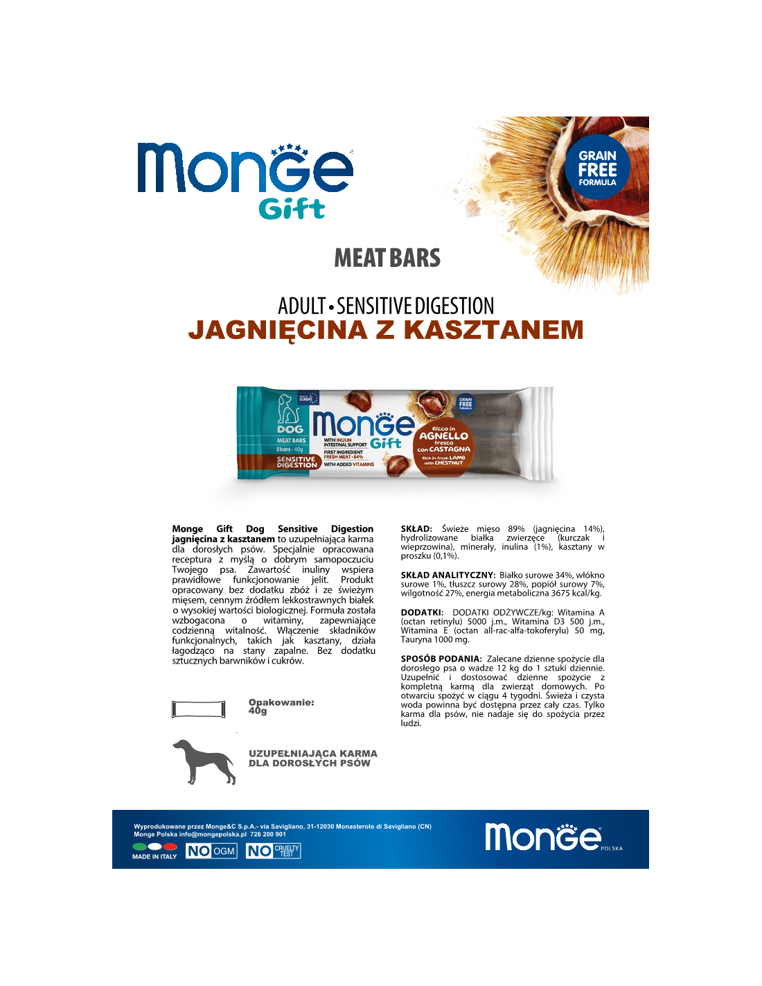 Monge Gift Meat Bars Sensitive Digestion Dog Adult Lamm mit Kastanien ist ein köstlicher Snack mit Superfood-Power in Form von Fleischriegeln (2 Stück / 40 g).