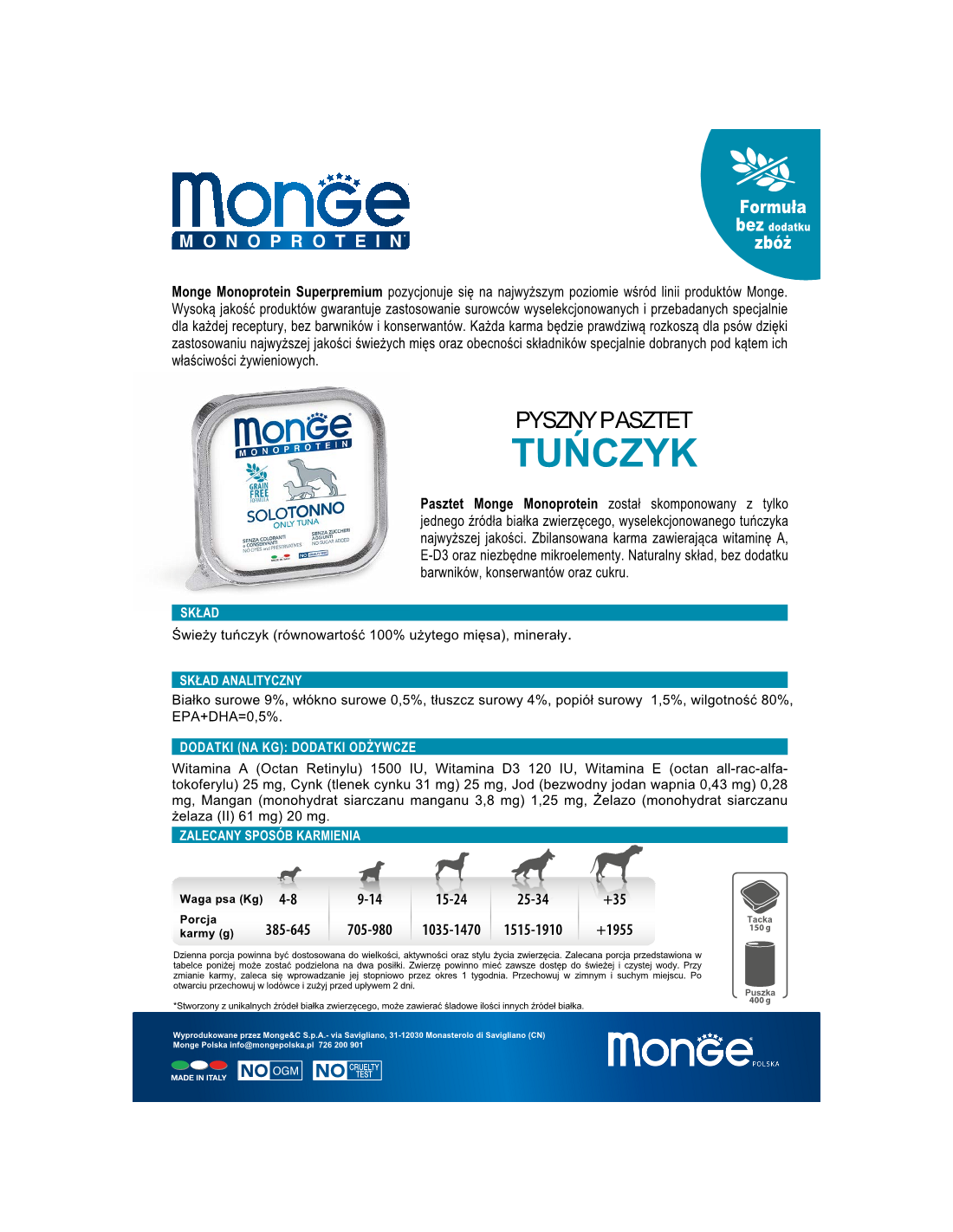 Monge MONOPROTEIN Tuna is a tasty pasty from a line of single-protein foods made from selected tuna meat of the highest quality. A 100% Italian recipe rich in vitamins A, E, D3 with a guaranteed protein source from only one type of meat. No artificial colours or preservatives. Sugar-free formula.