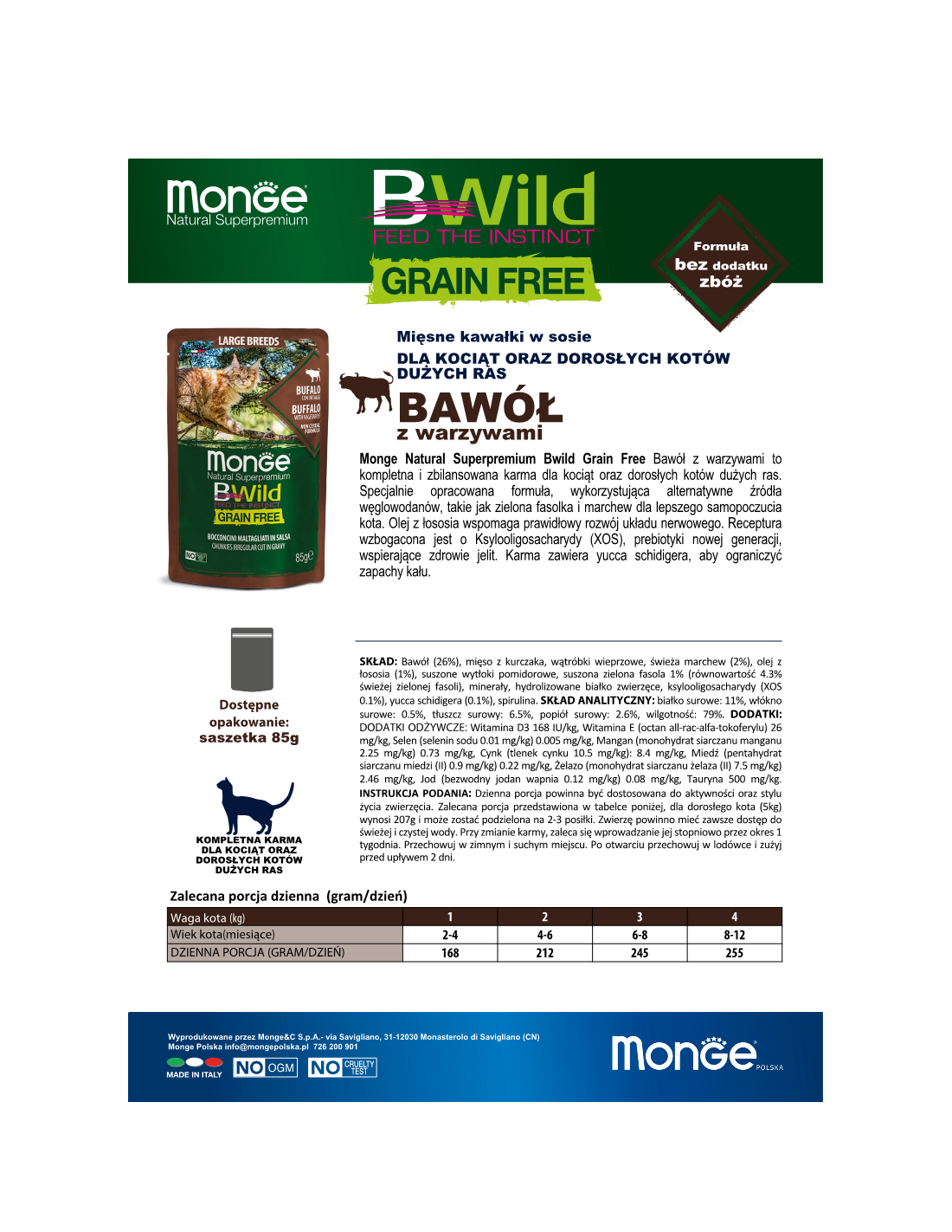 Monge Natural Superpremium BWild Grain Free Buffalo with Vegetables (green beans and carrots) is a complete and balanced food for kittens and adult large breed cats.