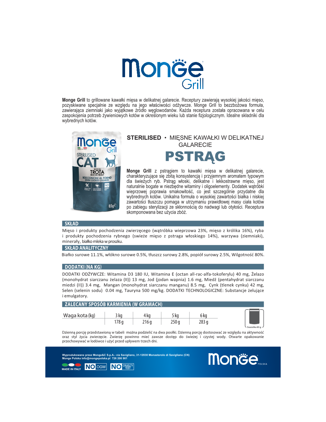 Monge Natural Superpremium Grilled Cat Sterilised Trout is a complete and grain-free food for adult sterilised cats. Roasted cuts of meat to bring your cat closer to the perfect diet. The recipe contains high-quality animal protein sources, selected for their nutritional properties.