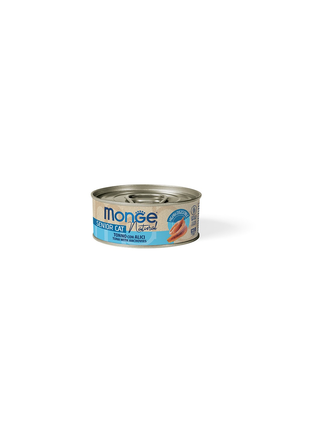 Monge Jelly senior yellowfin tuna with anchovies is a complementary food for older cats. Pieces of steamed tuna with anchovies in a delicious and delicate jelly are an easily digestible meal that has a beneficial effect on the condition of cats' skin and fur, thanks to the high biological value of the protein contained in the food. The product is completely natural, in its own juice, without dyes, preservatives and gluten. It helps you stay fit, fresh and energetic every day.
