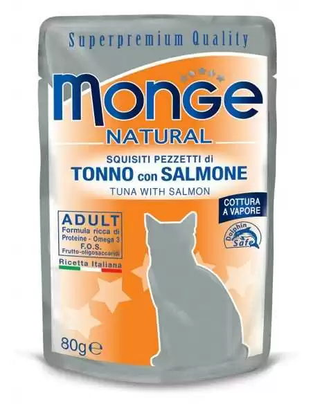 Monge Natural gourmet tuna fillets with salmon in jelly as a complementary food for cats has all the characteristics of top quality products: palatability, top quality ingredients with high nutritional value, rich in Omega 3 acids and protein and low in fat. The product is completely natural with no colourings or preservatives and no gluten.