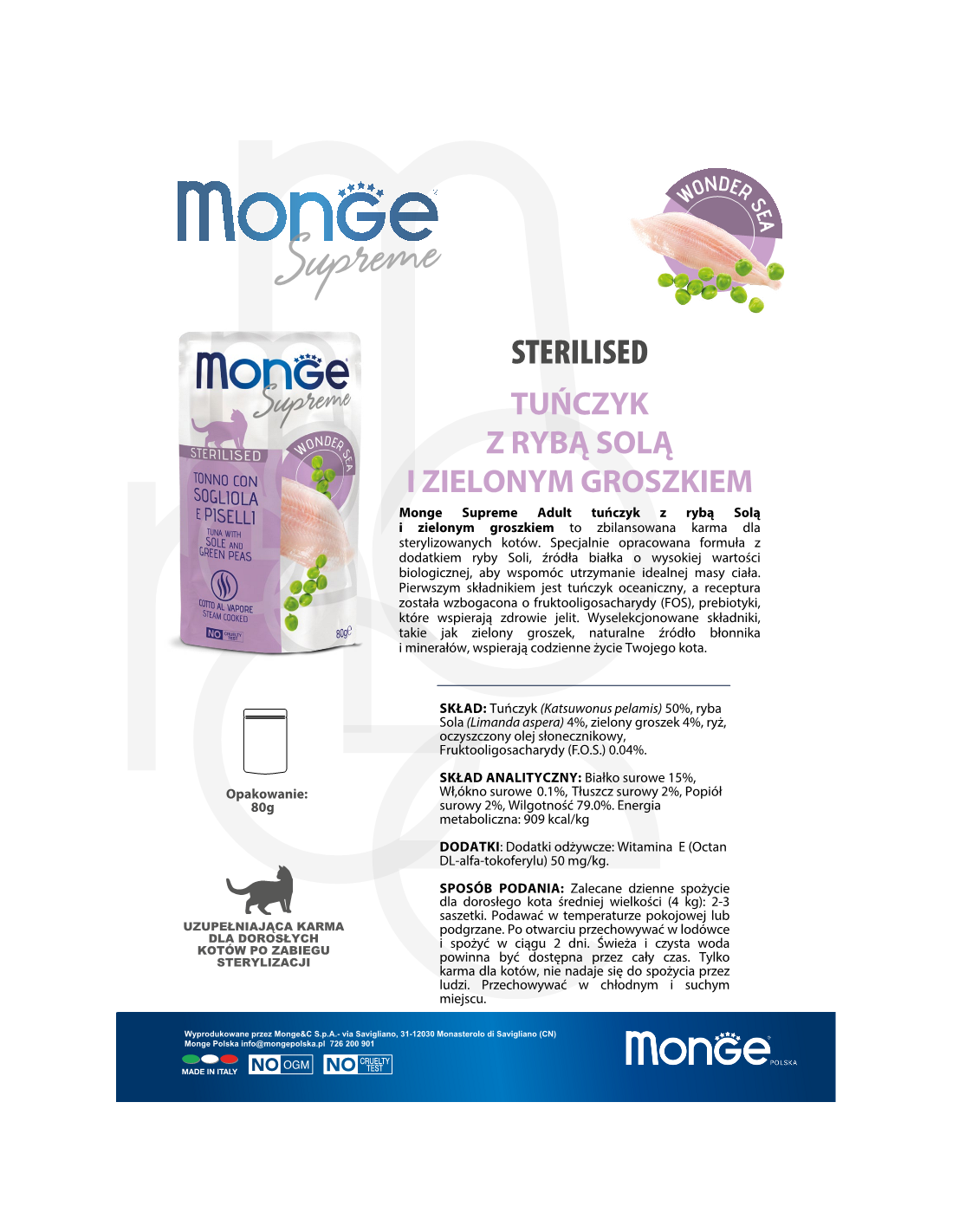 Monge Natural Superpremium Supreme Cat Sterilised Tuna with Salt Fish and Peas is a balanced, complementary food for adult sterilised cats. Delicious fillets created from meat cooked by steaming, which preserves all the nutritional values, plus it becomes easily digestible.