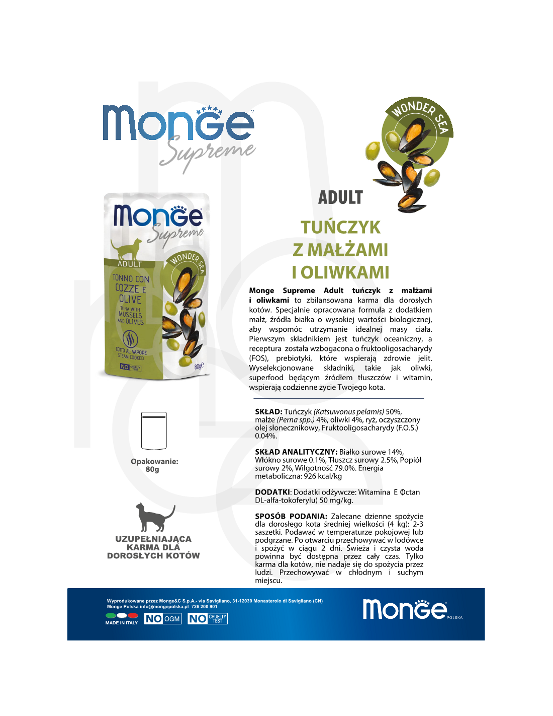 Monge Natural Superpremium Supreme Cat Adult Tuna with mussels and olivesis a balanced, complementary food for adult cats. Delicious fillets created from meat cooked by steaming, which preserves all the nutritional values, plus it becomes easy to digest.
