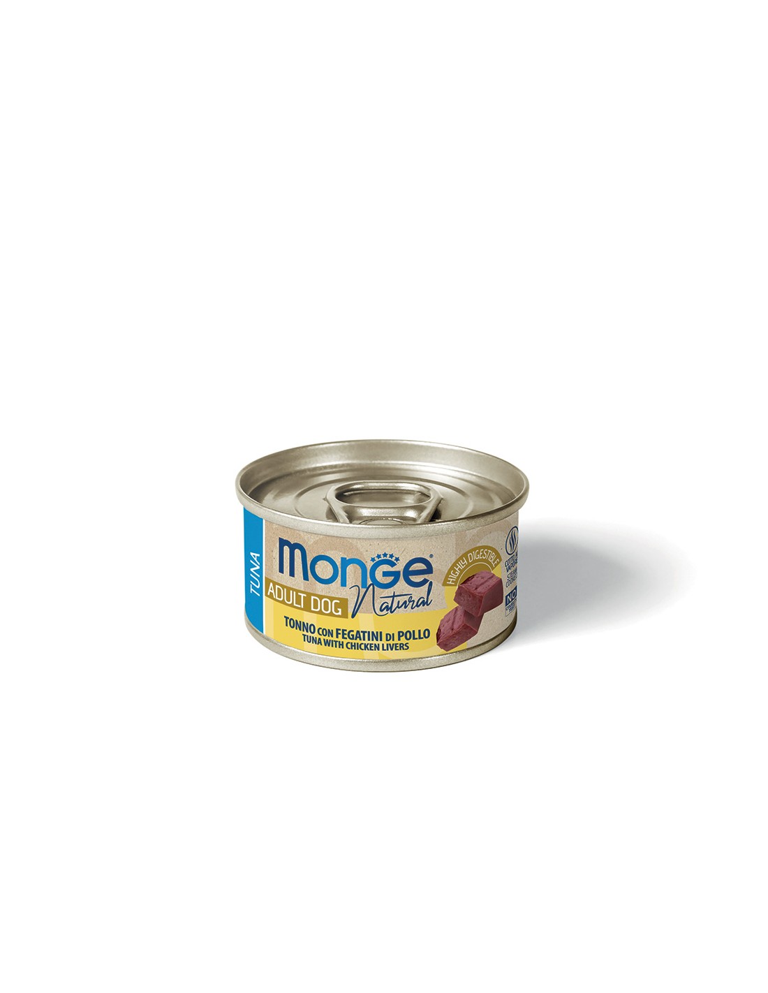 MONGE DOG NATURAL Tuna with Liver and Chicken 95 g is a high-quality wet food specially designed for adult dogs. Tender pieces of tuna and chicken combined with liver provide an exceptional taste, high digestibility, and support healthy functioning in your dog. The natural recipe contains no artificial preservatives, colorants, or gluten, making it ideal for daily feeding or as a tasty addition to complete dog food.