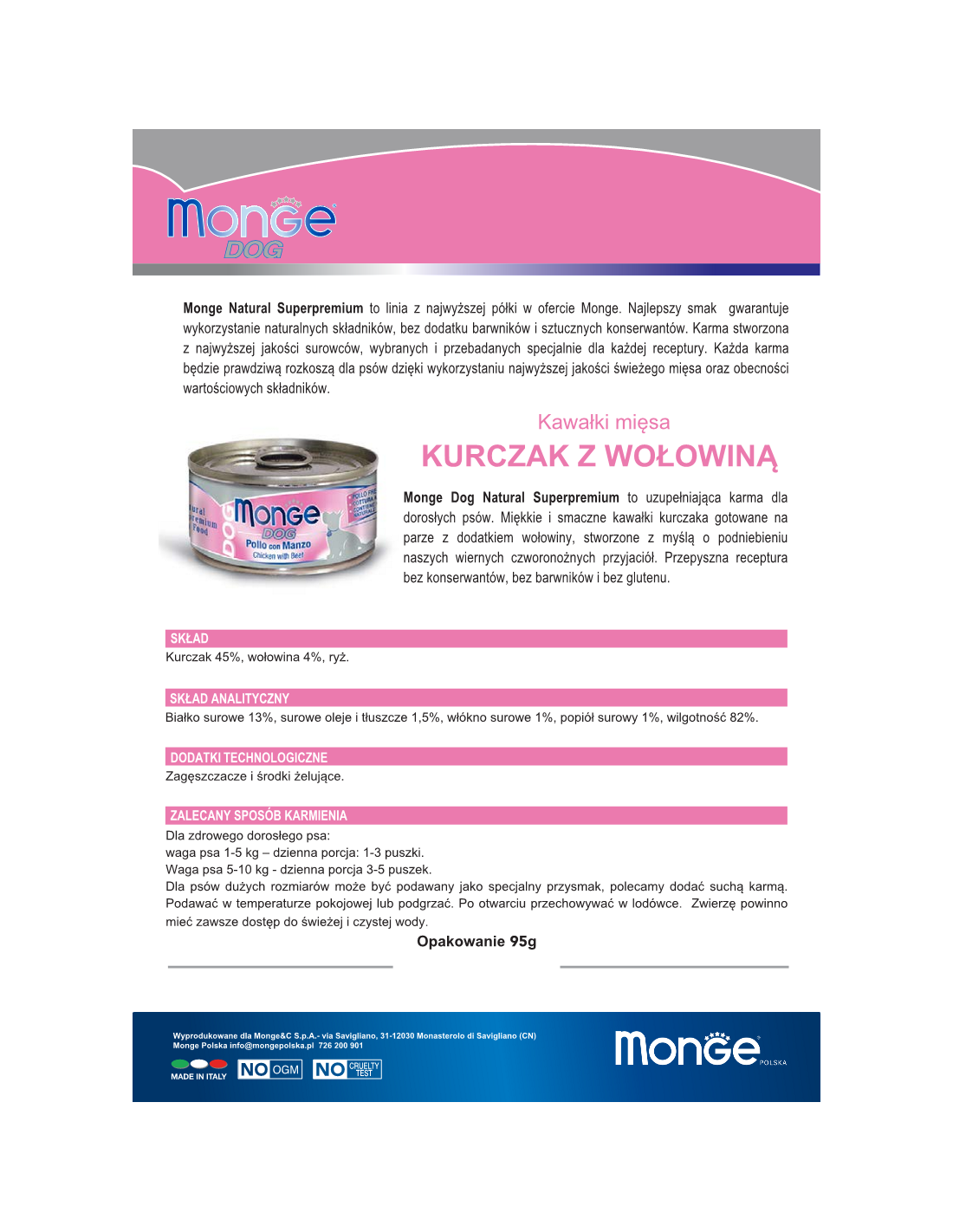 Monge Dog Natural Superpremium is a complementary food for adult dogs. Soft and tasty pieces of chicken with added beef cooked in steam, created with the palate of our loyal four-legged friends in mind. A delicious recipe with no preservatives, no colours and no gluten.