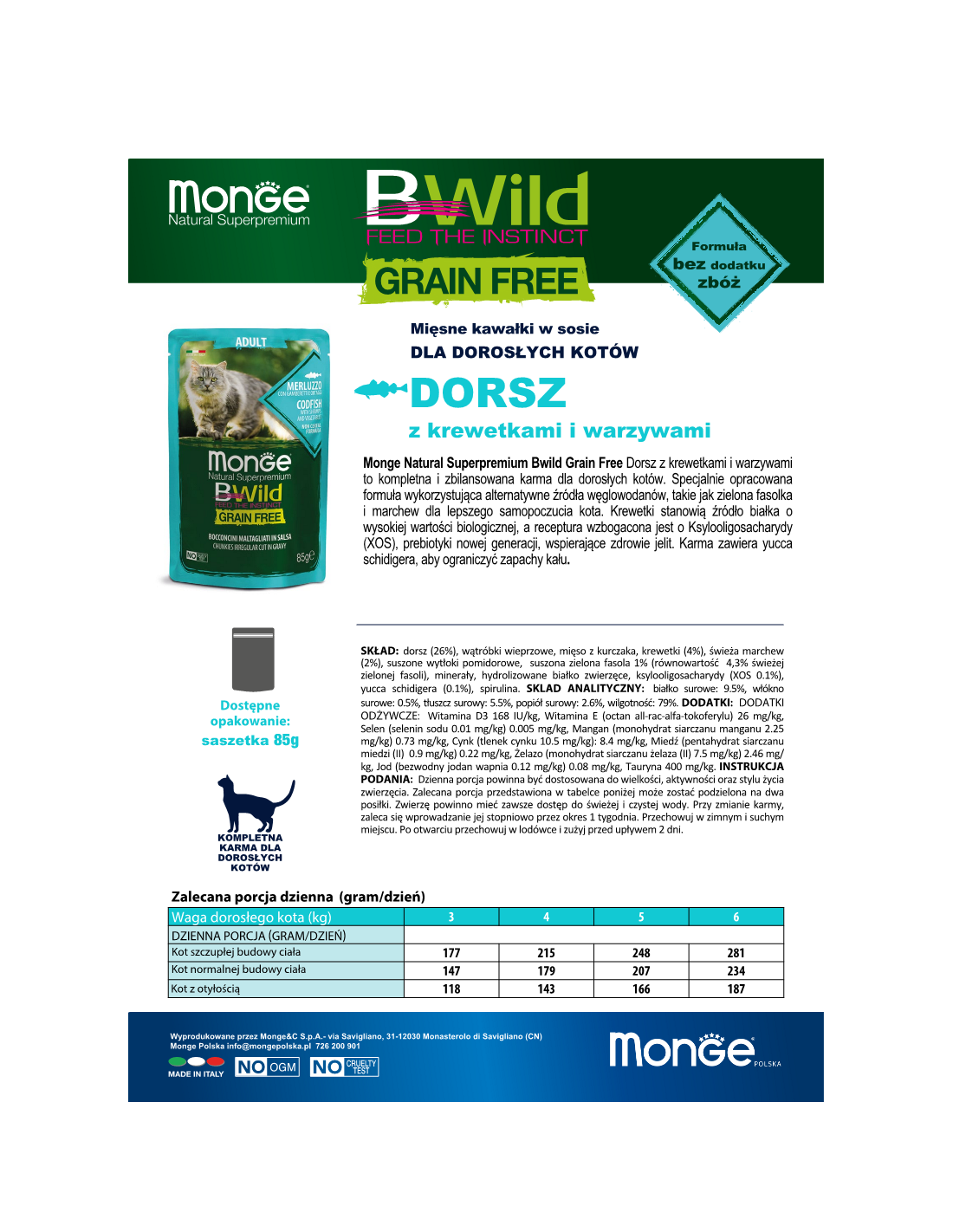 Monge Natural Superpremium BWild Grain Free Cod with prawns and vegetables (green beans and carrots) is a complete and balanced food for adult cats.