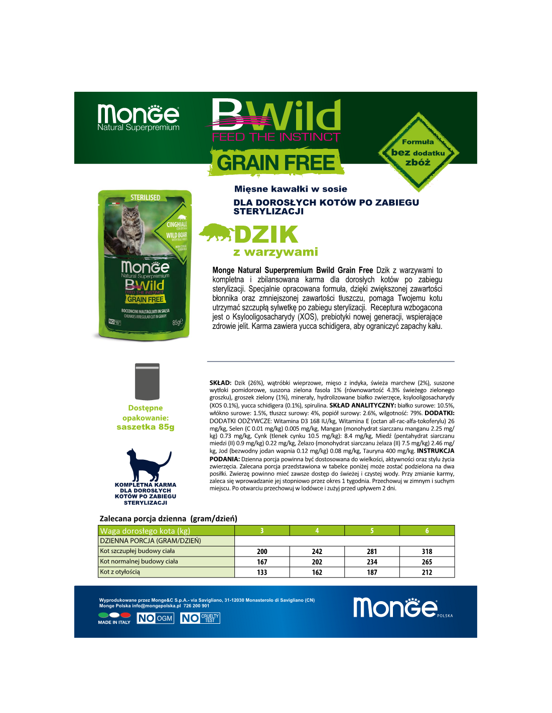 Monge Natural Superpremium BWild Grain Free Boar with vegetables (green beans and carrots) is a complete and balanced food for adult sterilised cats.