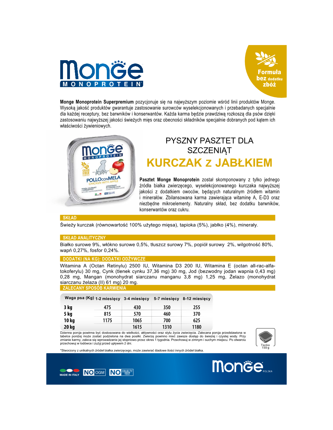 Monge MONOPROTEIN Junior Chicken with Apple is a tasty pasty from the line of single-protein foods made from selected chicken meat of the highest quality with apple for puppies. 100% Italian recipe rich in vitamins A, E, D3 with guaranteed protein source from only one type of meat. No artificial colours or preservatives. Sugar-free formula.
