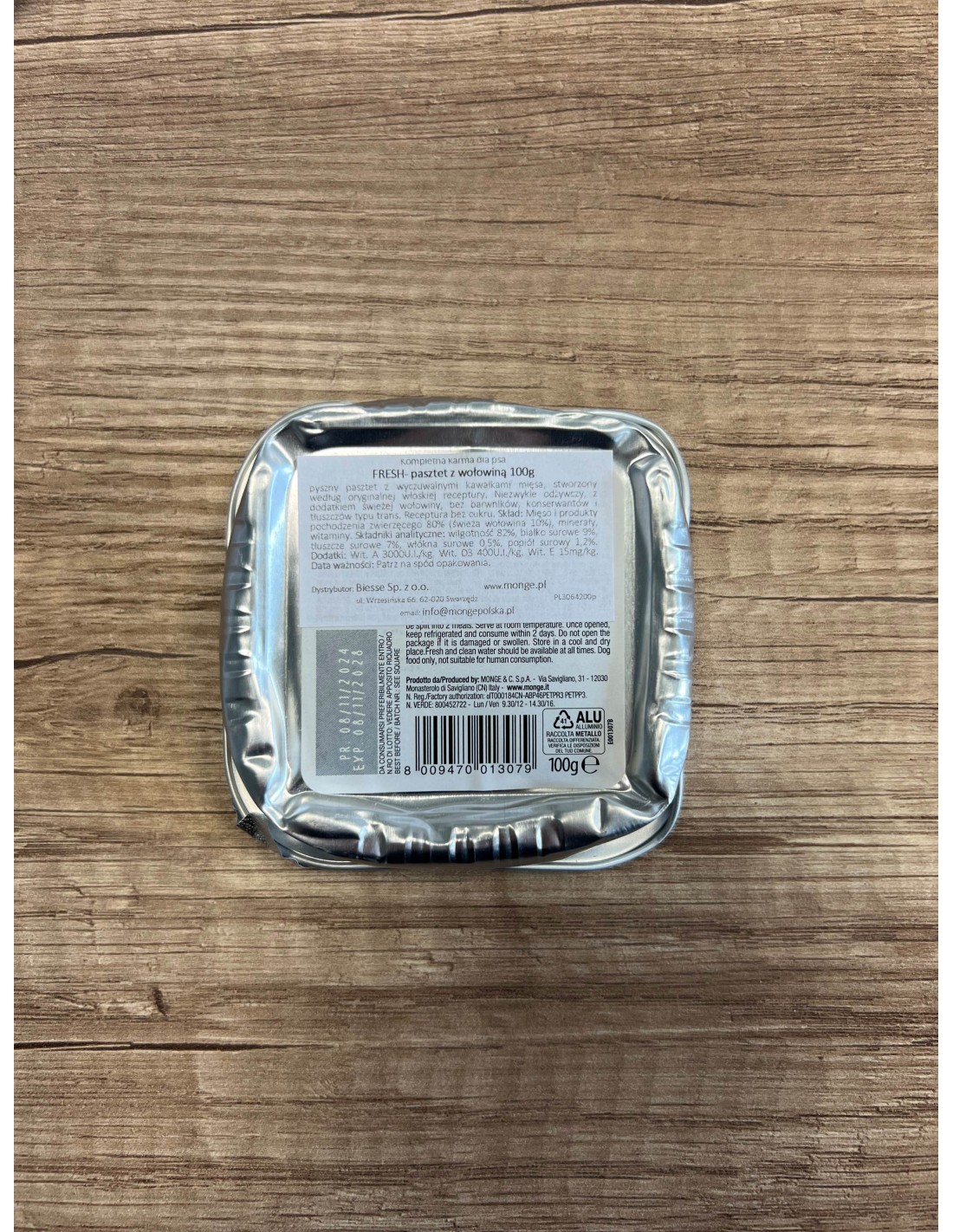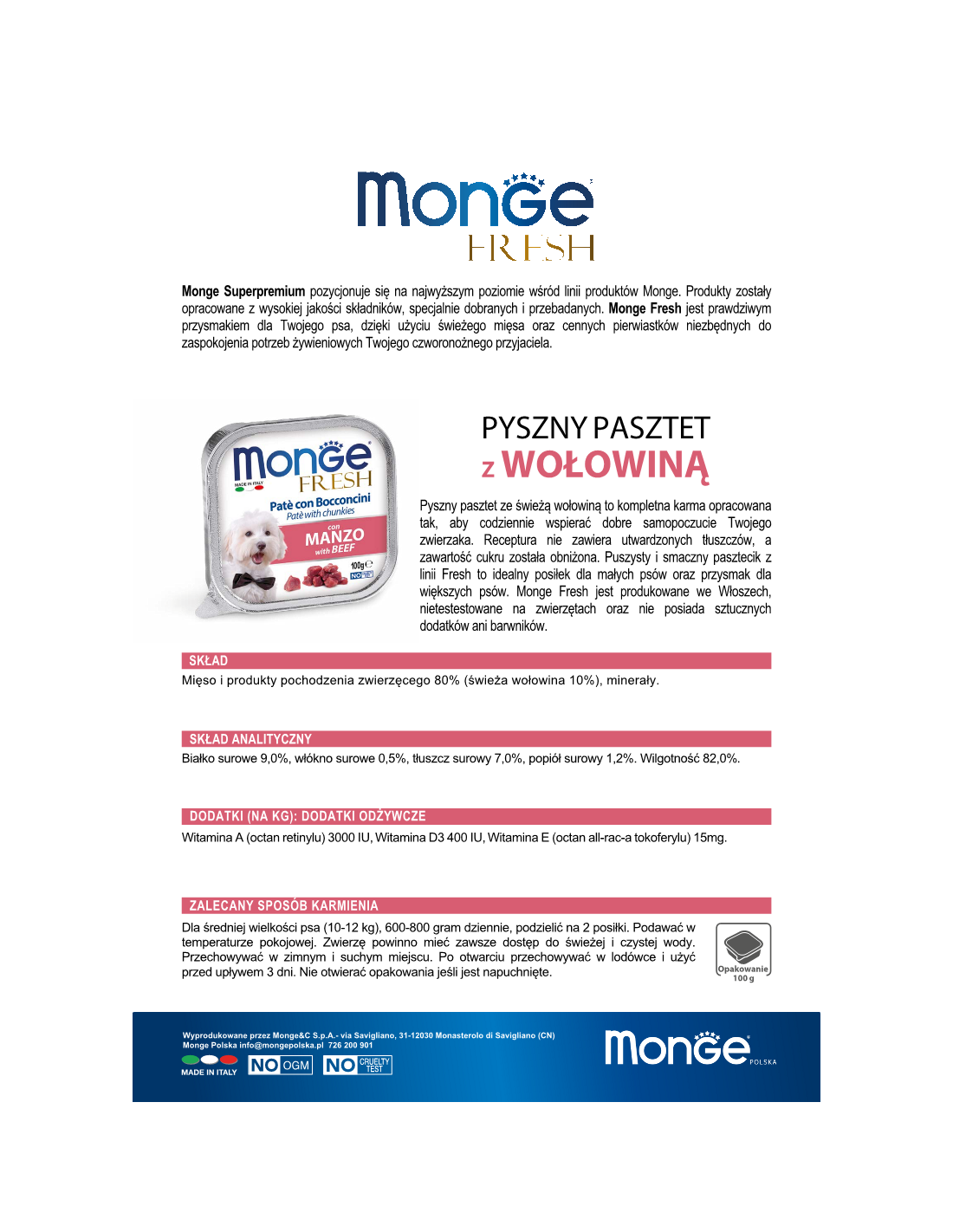 MONGE FRESH delicious pate with fresh beef is a complete food developed to support your pet's well-being on a daily basis. The recipe contains no hydrogenated fats. The fluffy and tasty pate from the Fresh line is the ideal meal for small dogs and a treat for larger ones. Monge Fresh is made in Italy, not tested on animals and has no artificial additives or colours.