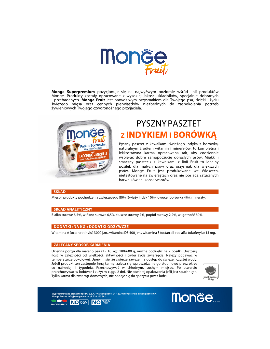 Monge Fruit Pate with turkey and blueberries is a delicious pate with palpable chunks of meat, made according to an original Italian recipe. Extremely nutritious, with turkey and blueberries, without colourings, preservatives or trans fats.