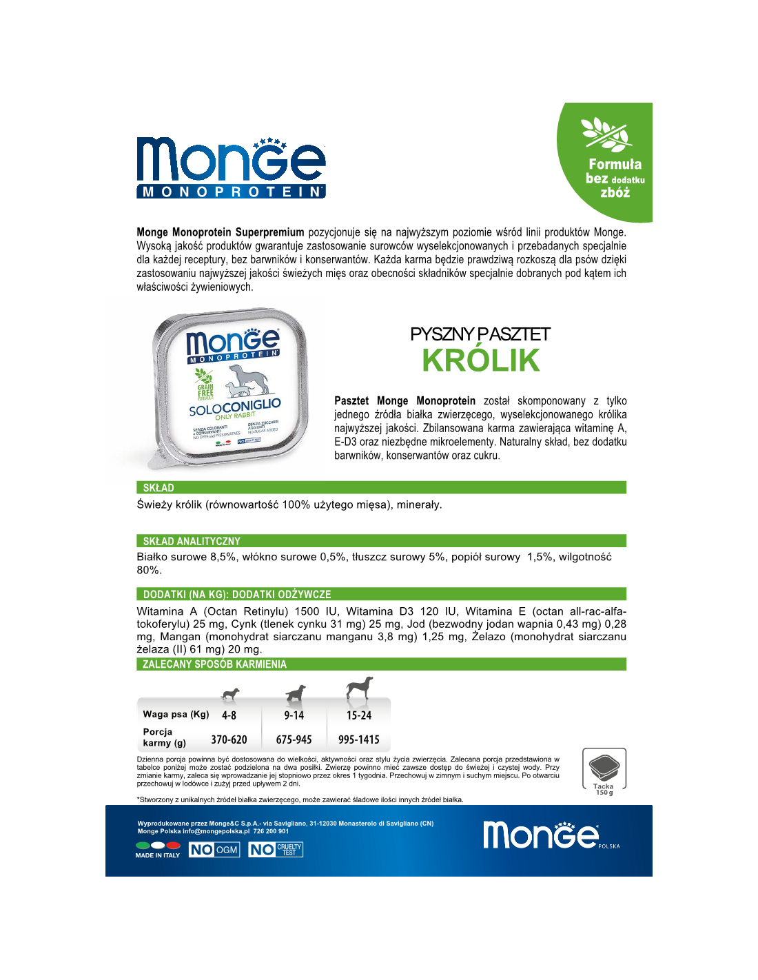 Monge MONOPROTEIN Rabbit is a tasty pasty from a line of single-protein foods made from selected rabbit meat of the highest quality. A 100% Italian recipe rich in vitamins A, E, D3 with a guaranteed protein source from only one type of meat. No artificial colours or preservatives. Sugar-free formula.