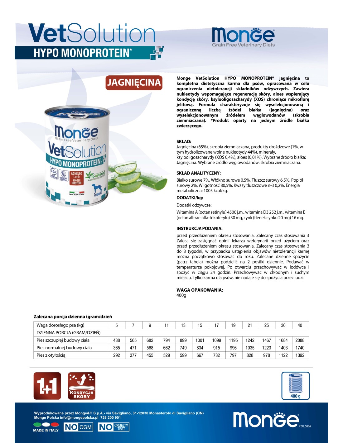MONGE VETSOLUTION CANINE HYPO MONOPROTEIN* LAMB is a complete dietetic pet food for dogs formulated for the reduction of ingredient and nutrient intolerances.