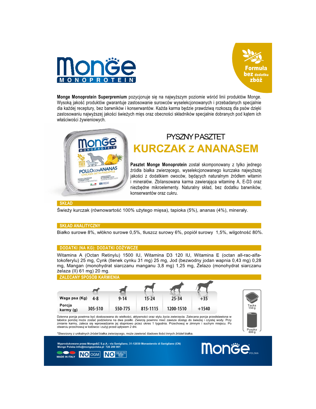 Monge Monoprotein Superpremium Kurczak z ananasem będzie prawdziwą rozkoszą dla psów dzięki zastosowaniu najwyższej jakości świeżych mięs oraz obecności składników specjalnie dobranych pod kątem ich właściwości żywieniowych. Pasztet Monge Monoprotein został skomponowany z tylko jednego źródła białka zwierzęcego, wyselekcjonowanego kurczaka najwyższej jakości z dodatkiem owoców, będących naturalnym źródłem witamin i minerałów. Zbilansowana karma zawierająca witaminę A, E-D3 oraz niezbędne mikroelementy. Naturalny skład, bez dodatku barwników, konserwantów oraz cukru.