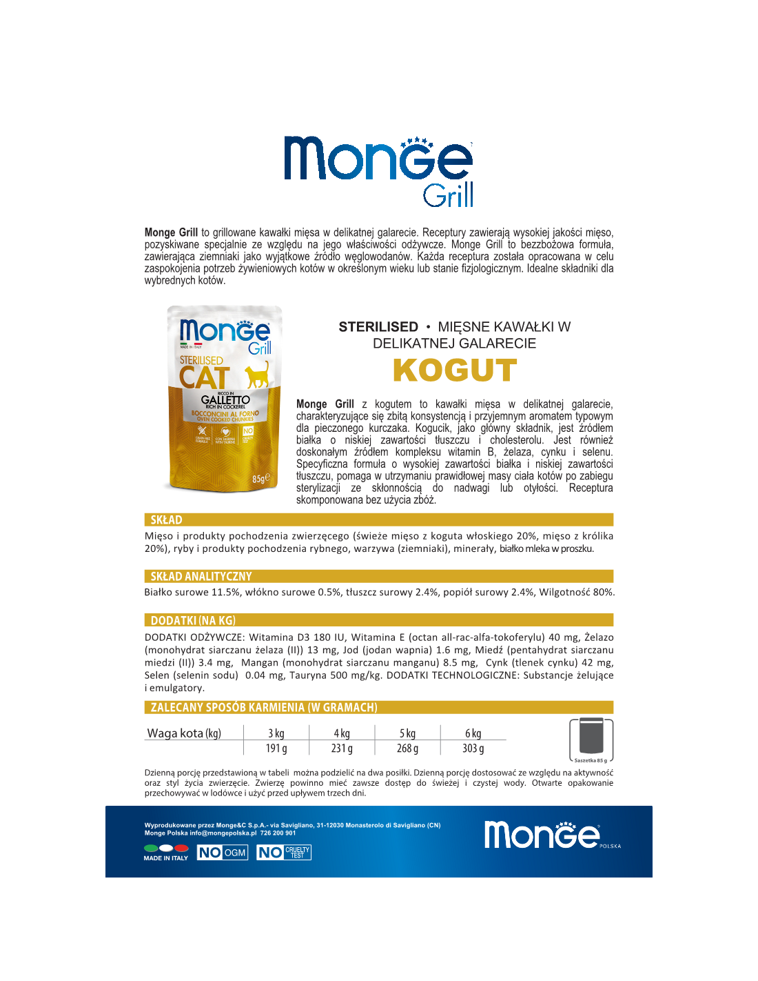 Monge Natural Superpremium Grill Cat Sterilised Kogut to kompletna i bezzbożowa karma dla dorosłych wysterylizowanych kotów. Pieczone kawałki mięsa, które przybliżą Twojego kota do idealnej diety. Receptura zawiera wysokiej jakości źródła białka zwierzęcego, dobrane pod kątem ich właściwości odżywczych.