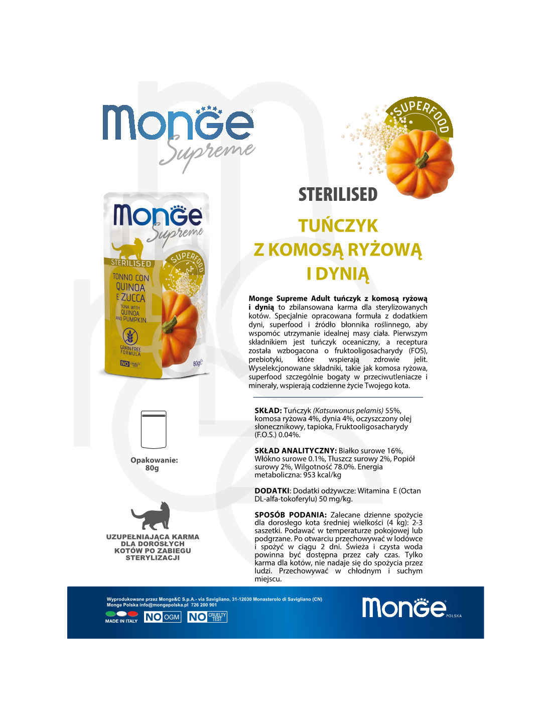 Monge Natural Superpremium Supreme Cat Sterilised Tuńczyk z komosą ryżową i dynią to zbilansowana, uzupełniająca karma dla dorosłych wysterylizowanych kotów. Pyszne filety stworzone z mięsa gotowanego na parze, co pozwala na zachowanie wszystkich wartości odżywczych, a dodatkowo staje się ono lekkostrawne.