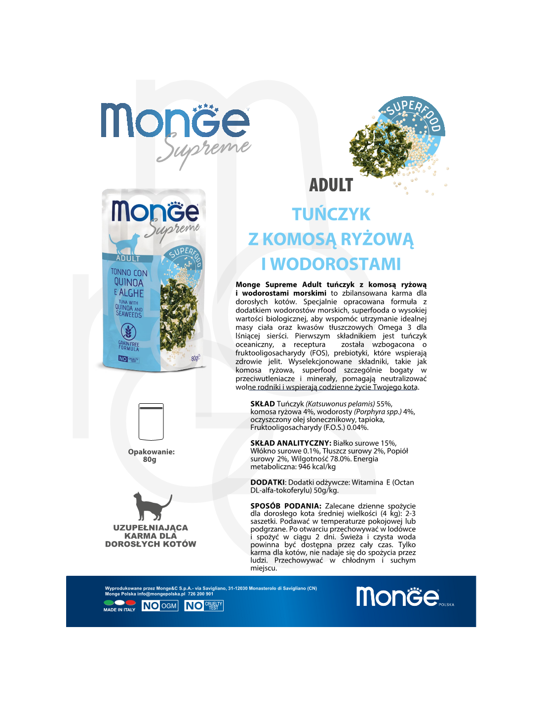 Monge Supreme saszetka Adult Tuńczyk z komosą ryżową i wodorostami 80g