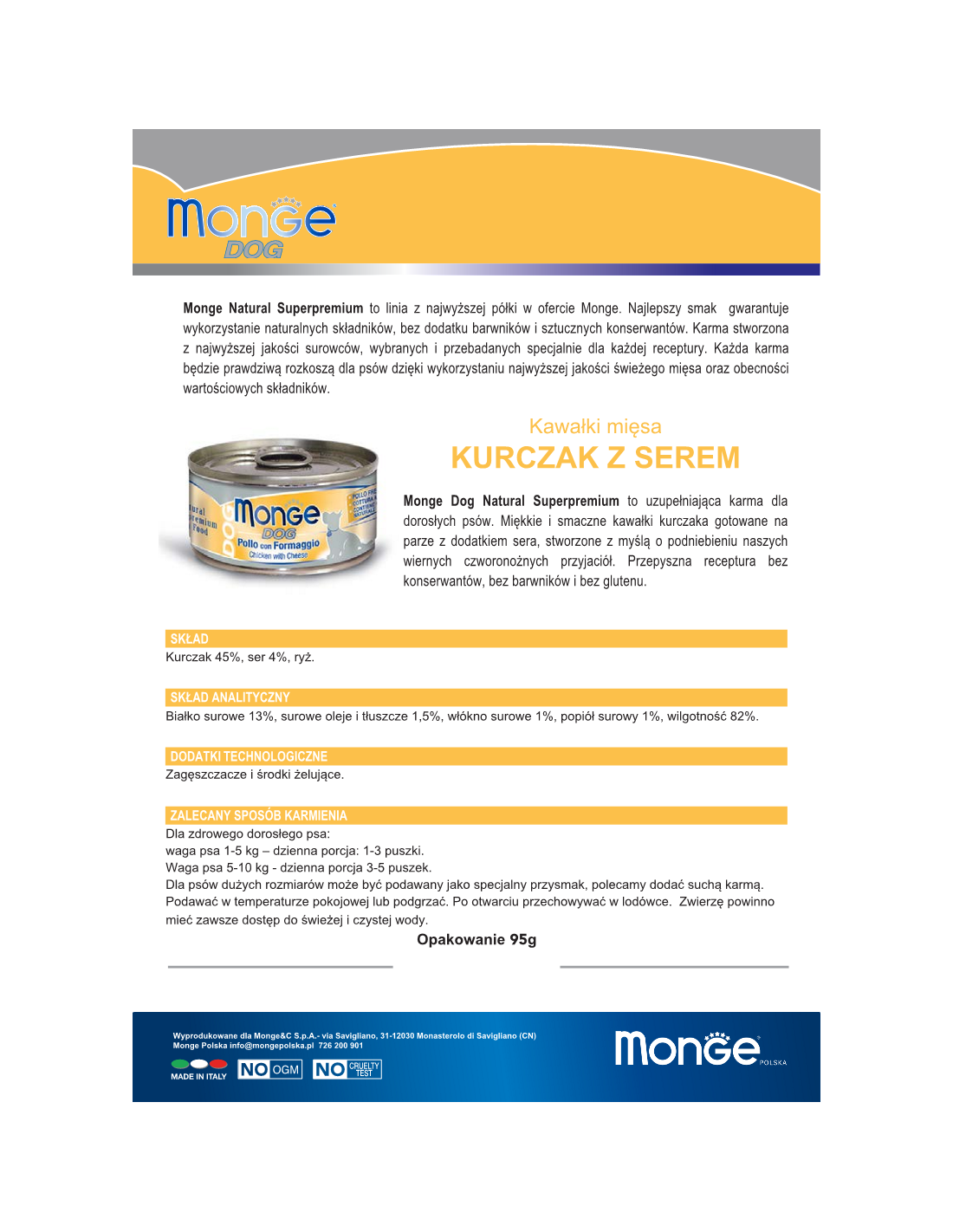 MONGE DOG NATURAL KURCZAK Z SEREM 95g