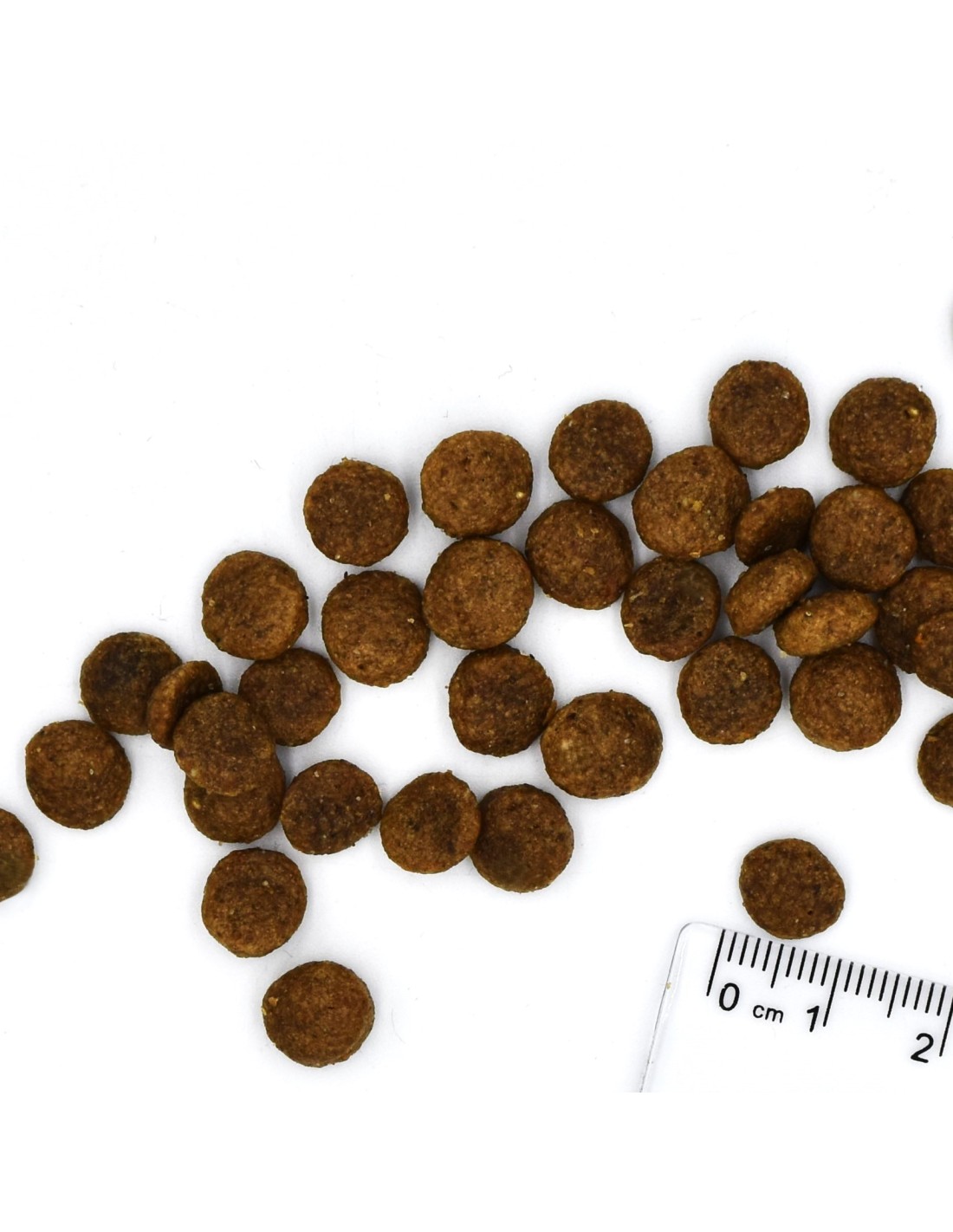 SKŁADNIKI ANALITYCZNE: białko surowe 31%, włókno surowe 2%, tłuszcz surowy 20%, popiół surowy 8%, wapń 1%, fosfor 0,6%, kwasy tłuszczowe n-3: 0,8%, kwasy tłuszczowe n-6: 3,85%, tauryna : 0,3%.