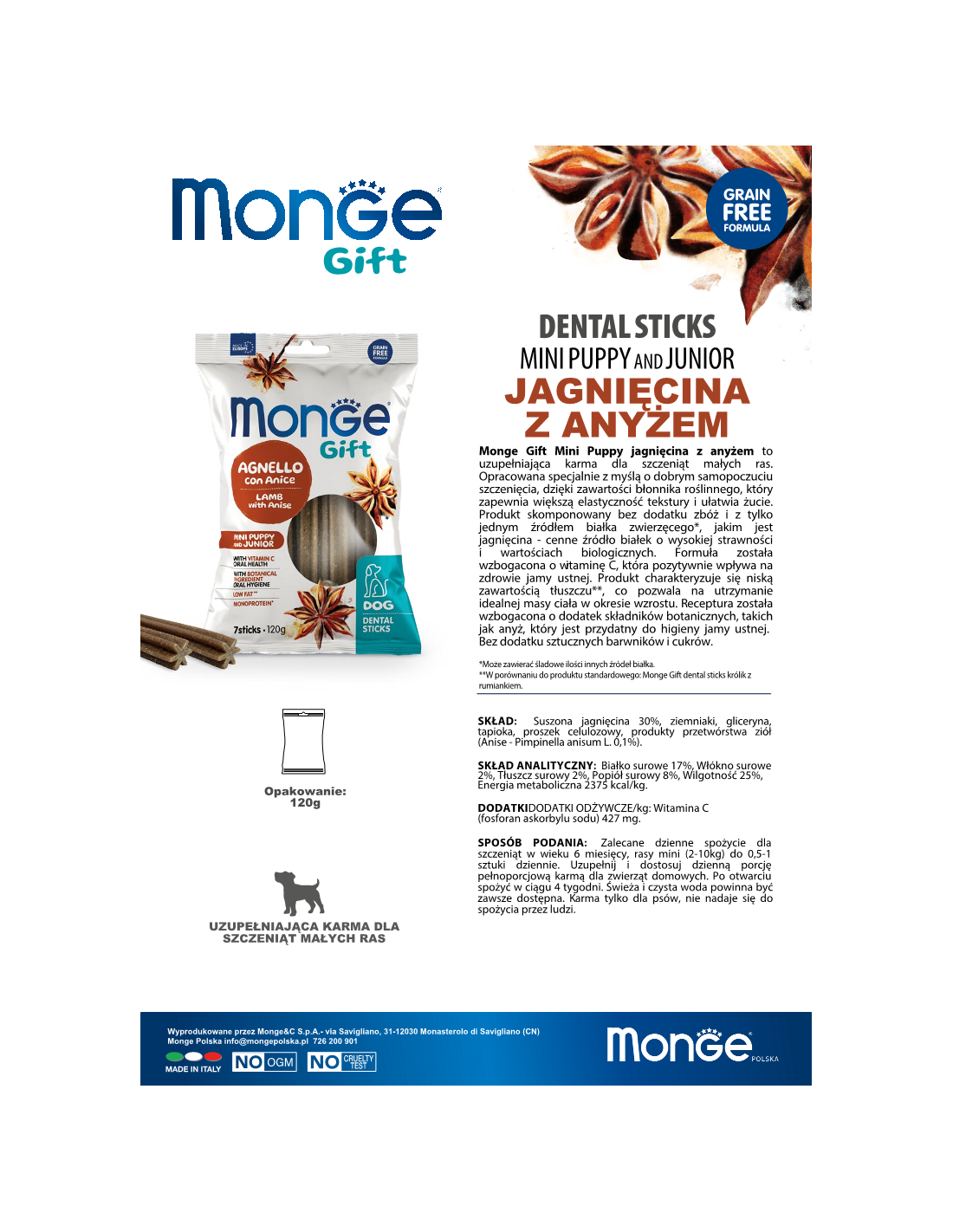 Monge Gift Dental Sticks Mini Puppy and Junior Jagnięcina z anyżem to uzupełniająca i bezzbożowa karma dla rosnących szczeniąt ras małych. Specjalnie opracowana dla dobrego samopoczucia szczeniaka dzięki włączeniu włókna roślinnego dla większej elastyczności tekstury i wspomagania żucia. Formuła oparta o jedno źródło białka zwierzęcego - jagnięcinę, która zawiera cenne źródła wysokostrawnych i biologicznie wartościowych białek.