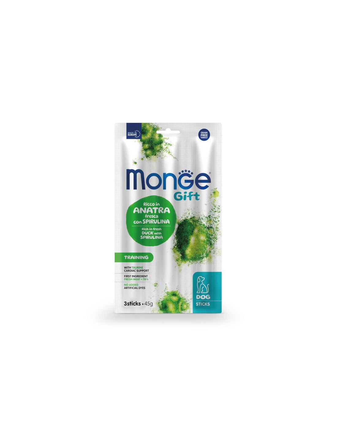 Monge Gift Sticks Training Dog Adult Kaczka ze spiruliną to pyszna przekąska z mocą superfood w formie półmiękkich paluchów (3 sztuki/45g).