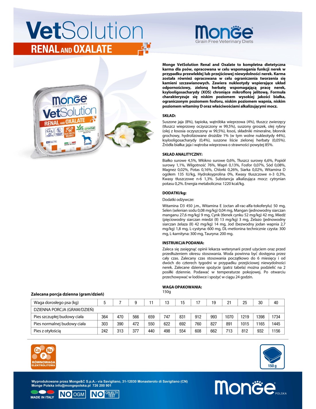 Monge VetSolution Renal and Oxalate to kompletna dietetyczna karma dla psów, opracowana w celu wspomagania czynności nerek w przypadku przewlekłej lub przejściowej niewydolności nerek oraz w celu ograniczenia tworzenia się kamieni szczawianowych. Zawiera nukleotydy wspierające układ odpornościowy, zieloną herbatę wspomagającą pracę nerek, ksylooligosacharydy (XOS) chroniące mikroflorę jelitową. Formuła charakteryzuje się niskim poziomem białka wysokiej jakości, ograniczonym poziomem fosforu, niskim poziomem wapnia i witaminy D oraz właściwościami alkalizującymi mocz.